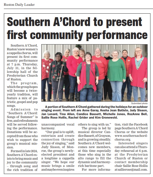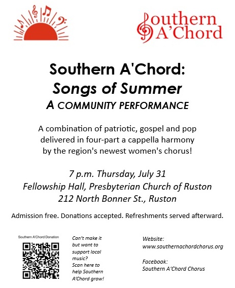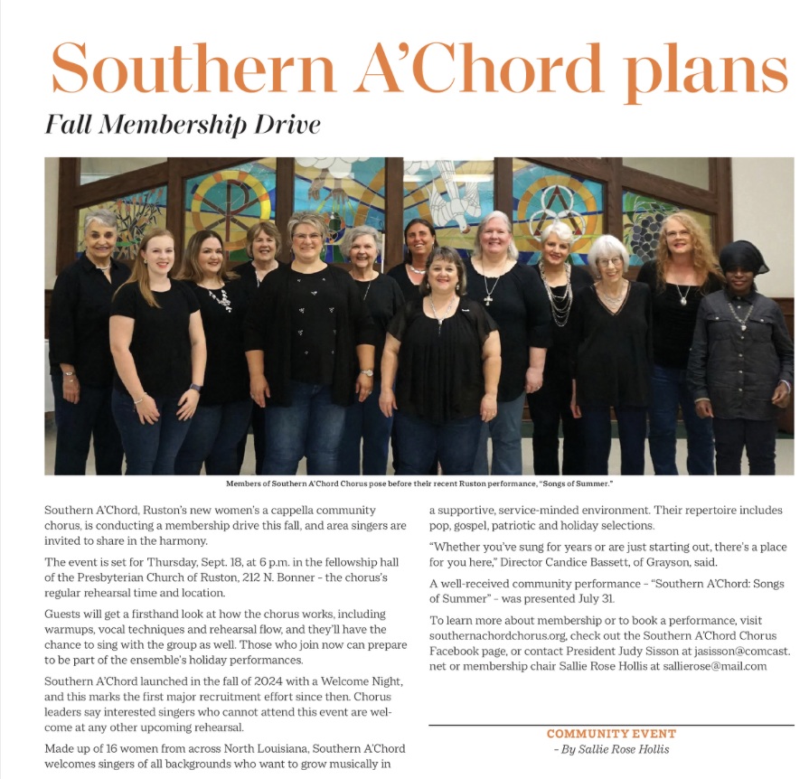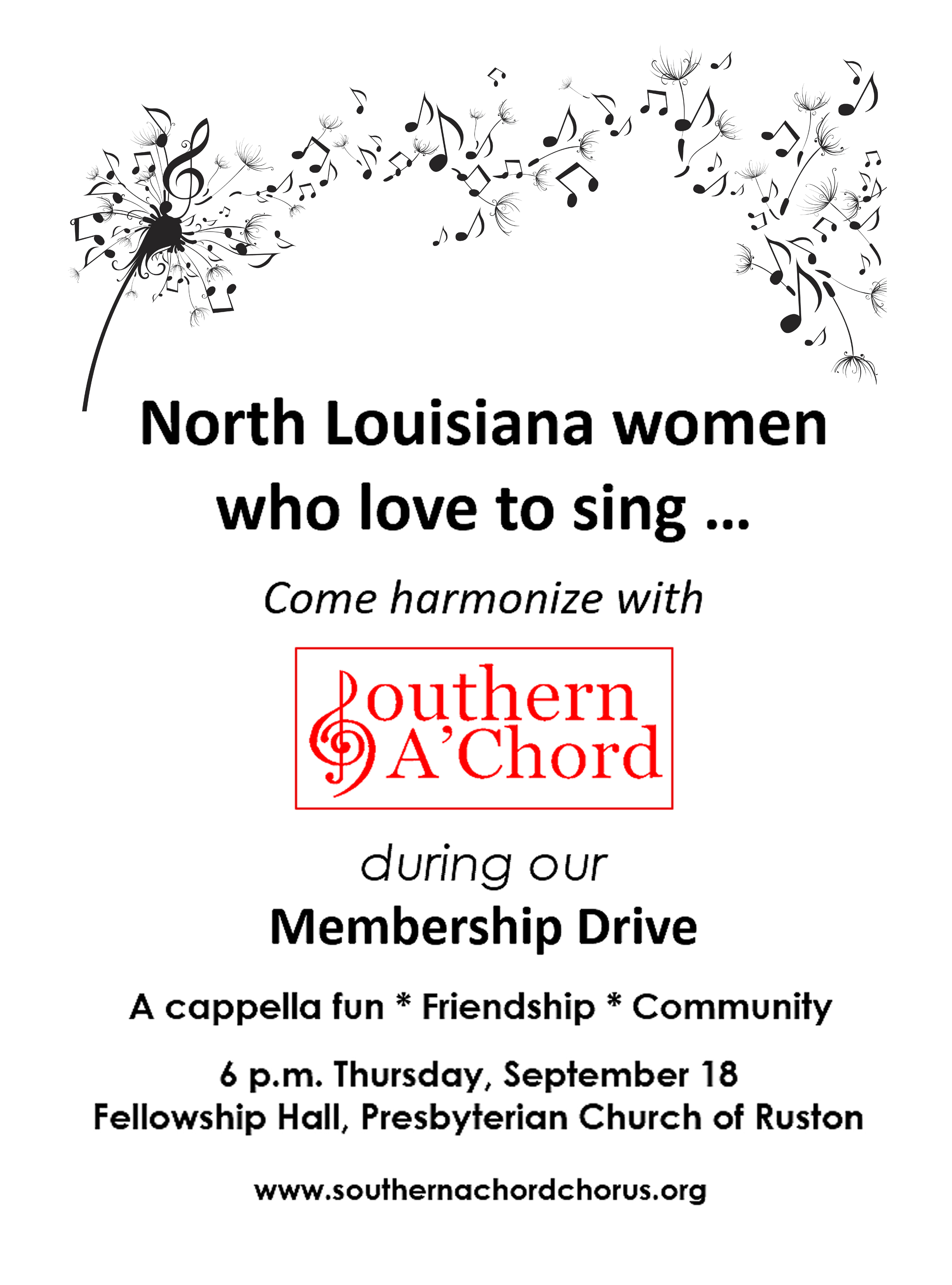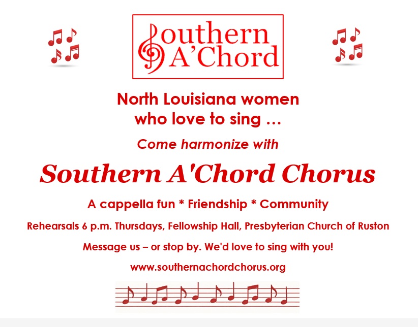 | Southern A'Chord is getting ready to join the North Louisiana arts scene very soon! We're excited about it!!! Hope to see many of you at our recruitment event in the near future. |